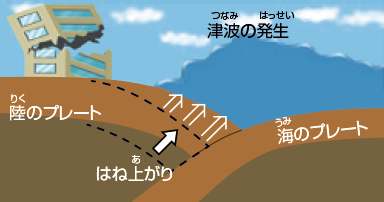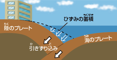 フィリピン海プレートが西日本を押し続け(もぐりこむ)限界に達すると、陸のプレートが跳ね上がり、海溝型の南海トラフ地震が発生します。