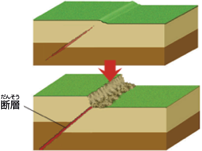 フィリピン海プレートが陸のプレートを圧迫することにより、活断層が割れ、兵庫県南部地震等の直下型地震が起こります。